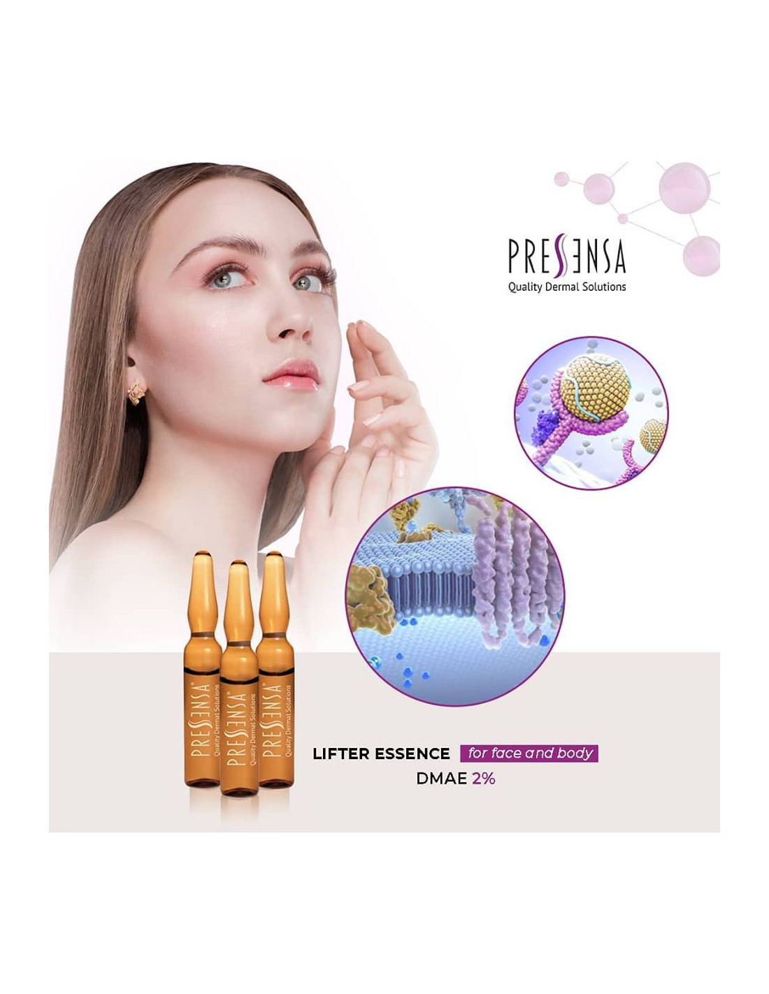 LIFTER ESSENCE DMAE: Produce un efecto reafirmante, mejorando la contractibilidad y firmeza de la piel, es una molécula tonificante. Establece y regula el mosaico fluido de la membrana celular y estimula la contracción de las proteínas en el líquido tisular, al mismo tiempo que retiene el agua en los tejidos.