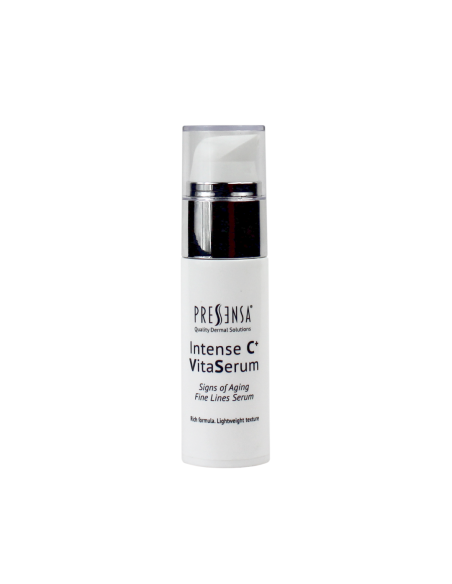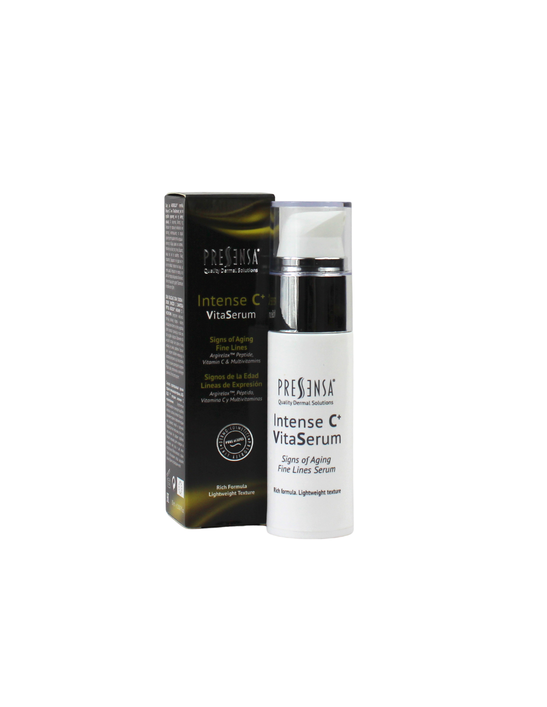 ALTA ACTIVIDAD ANTIOXIDANTE Y DESPIGMENTANTE: como sustancia reductora, la vitamina C actúa capturando las sustancias oxidantes y los radicales libres en la piel y desactivándolos. Asimismo, aumenta la elasticidad cutánea ya que promueve la síntesis de colágeno. Acción despigmentante: por supresión del proceso de pigmentación cutánea y degradación de la melanina. A la vez, puede prevenir la formación de pecas, lunares e hiperpigmentación asociada al envejecimiento cutáneo.