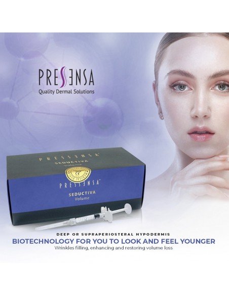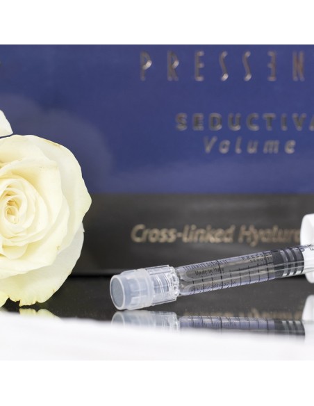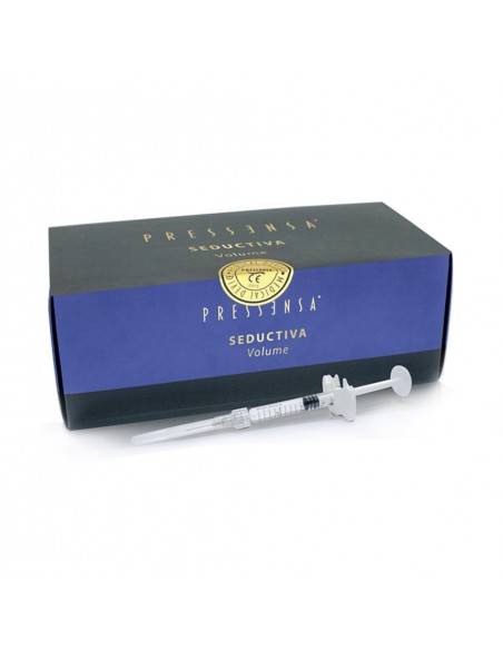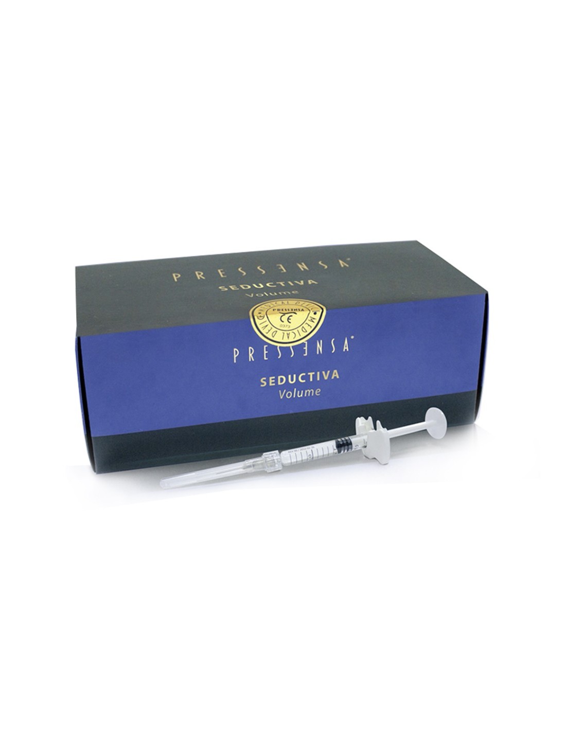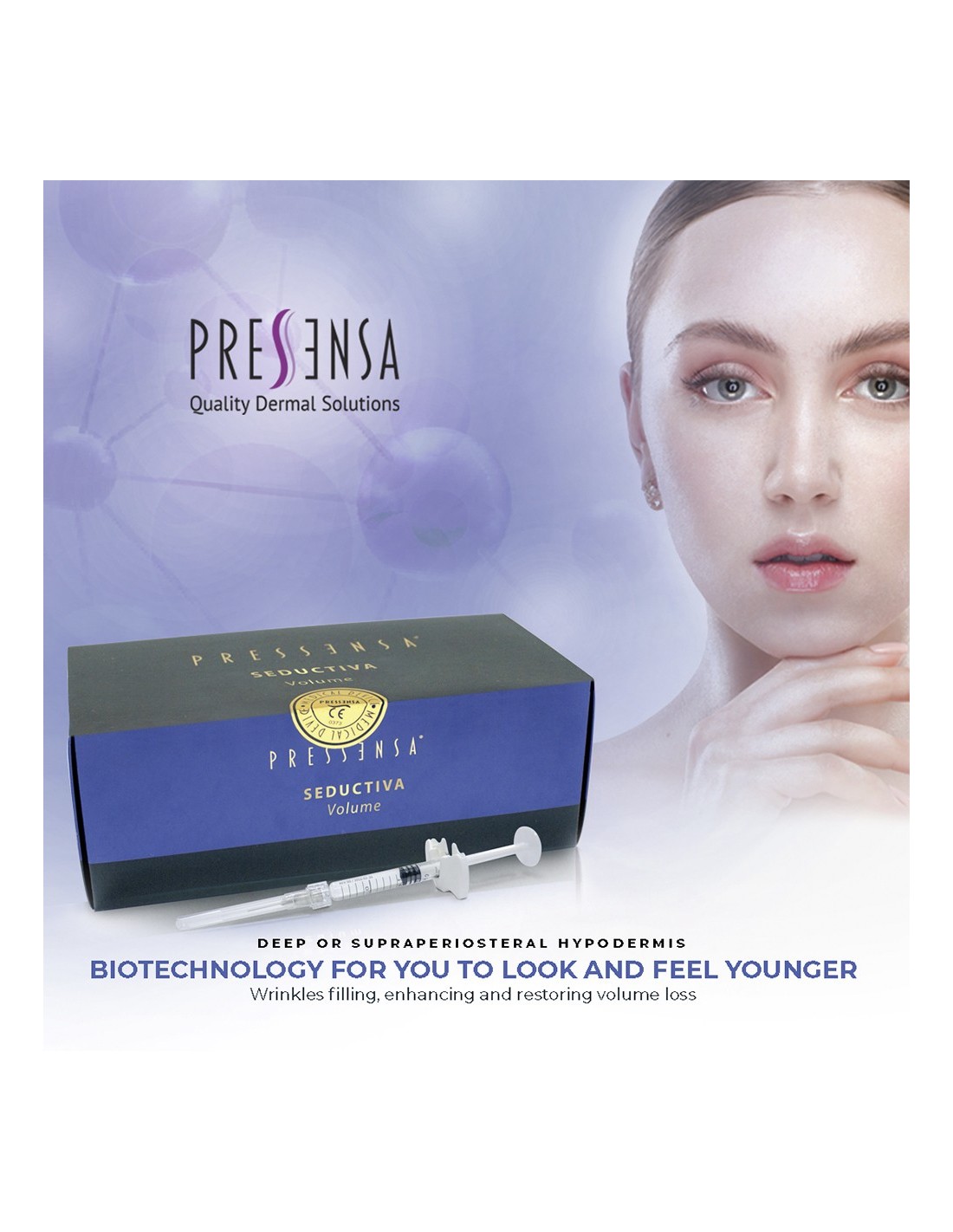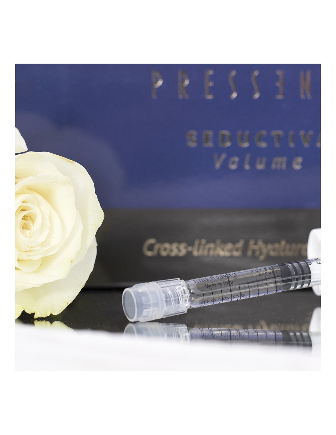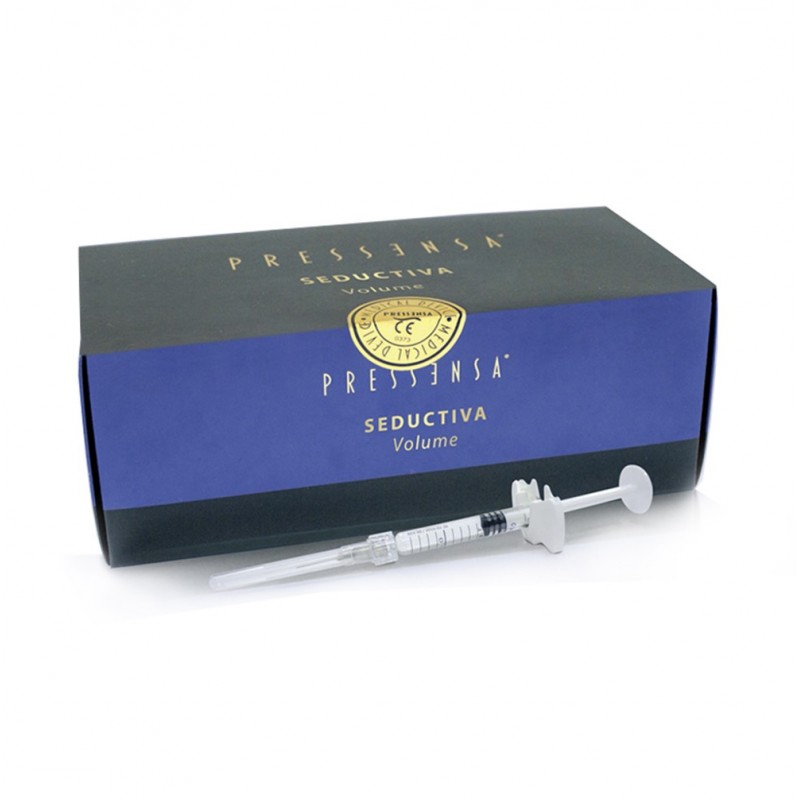 Pressensa SeductivaVolume - Филлер на основе ГК высокой степени очистки, который произведен по уникальной технологии комбинации высокомолекулярной (4000 кДа) и низкомолекулярной гиалуроновой кислоты (2400 кДа). Ретикулирующий агент BDDE. Благодаря оптимальному сочетанию вязко-эластичных свойств, данный продукт идеально подходит для объемной коррекции различных участков лица.